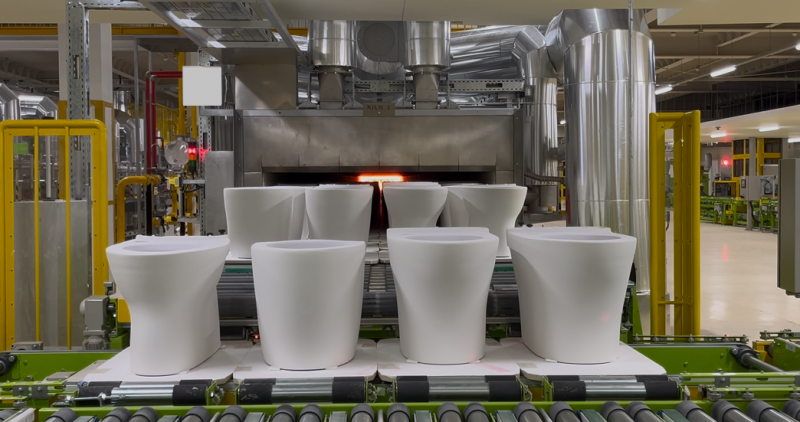工厂秉承环境友好的目标,在生产工序间的产品搬运全部实现了自动化,同时大量采用机器人作业。在环保方面导入脱硫脱硝装置、水循环利用装置,以及太阳能发电等。其中,烧成用辊道窑是TOTO集团海外公司首次引进,该窑炉使用可以旋转的滚筒,将放在烧成用的板材上的产品自动搬运、通过最高1200度的高温21小时自动烧成;高绝热的烧成窑能量损失很少,通过冷却过程中加热的空气和废热再利用来削减燃料,提高生产效率和能源效率,同时也大幅削减了二氧化碳的排放。